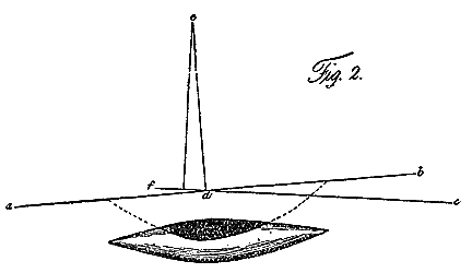 Let a b, fig. 2, represent such a surface or sail made of thin cloth, and containing about 200 square feet (if of a square form the side will be a little more than 14 feet); and the whole of a firm texture. Let the weight of the man and the machine be 200 pounds. Then if a current of wind blew in the direction c d, with a velocity of 35 feet per second, at the same time that a cord represented by c d would sustain a tension of 21 pounds, the machine would be suspended in the air, or at least be within a few ounces of it (falling short of such support only in the ratio of the sine of the angle of 94 degrees compared with radius; to balance which defect, suppose a little ballast to be thrown out) for the line d e represents a force of 200 pounds, which, as before, being resolved into d f and f e, the former will represent the resistance in the direction of the current, and the latter that which sustains the weight of the machine. It is perfectly indifferent whether the wind blow against the plane, or the plane be driven with an equal velocity against the air. Hence, if this machine were pulled along by a cord c d, with a tension of about 21 pounds, at a velocity of 35 feet per second, it would be suspended in a horizontal path; and if in lieu of this cord any other propelling power were generated in this direction, with a like intensity, a similar effect would be produced. If therefore the waft of surfaces advantageously moved, by any force generated within the machine, took place to the extent required, aerial navigation would be accomplished. As the acuteness of the angle between the plane and current increases, the propelling power required is less and less. The principle is similar to that of the inclined plane, in which theoretically one pound may be made to sustain all but an infinite quantity; for in this case, if the magnitude of the surface be increased ad infinitum, the angle with the current may be diminished, and consequently the propelling force, in the same ratio. In practice, the extra resistance of the car and other parts of the machine, which consume a considerable portion of power, will regulate the limits to which this principle, which is the true basis of aerial navigation, can be carried; and the perfect ease with which some birds are suspended in long horizontal flights, without one waft of their wings, encourages the idea, that a slight power only is necessary.