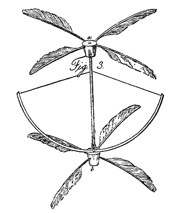 As it may be an amusement to some of your readers to see a machine rise in the air by mechanical means, I will conclude my present communication by describing an instrument of this kind, which any one can construct at the expense of ten minutes labour. a and b, fig. 3, are two corks, into each of which are inserted four wing feathers from any bird, so as to be slightly inclined like the sails of a windmill, but in opposite directions in each set. A round shaft is fixed in the cork a, which ends in a sharp point. At the upper part of the cork b is fixed a whalebone bow, having a small pivot hole in its centre, to receive the point of the shaft. The bow is then to be strung equally on each side to the upper portion of the shaft, and the little machine is completed. Wind up the string by turning the flyers different ways, so that the spring of the bow may unwind them with their anterior edges ascending; then place the cork with the bow attached to it upon a table, and with a finger on the upper cork press strong enough to prevent the string from unwinding, and taking it away suddenly, the instrument will rise to the ceiling. This was the first experiment I made upon this subject in the year 1796. If in lieu of these small feathers large planes, containing together 200 square feet, were similarly placed, or in any other more convenient position, and were turned by a man, or first mover of adequate power, a similar effect would be the consequence, and for the mere purpose of ascent this is perhaps the best apparatus; but speed is the great object of this invention, and this requires a different structure.