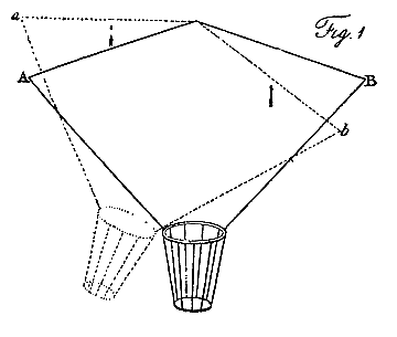 The powers of the machine being previously balanced, if the least pressure be exerted by the current, either upon the upper or under surface of the rudder, according to the will of the aeronaut, it will cause the machine to rise or fall in its path, so long as the projectile or propelling force is continued with sufficient energy. From a variety of experiments upon this subject I find, that, when the machine is going forward with a superabundant velocity, or that which would induce it to rise in its path, a very steady horizontal course is effected by a considerable depression of the rudder, which has the advantage of making use of this portion of sail in aiding the support of the weight. When the velocity is becoming less, as in the act of alighting, then the rudder must gradually recede from this position, and even become elevated, for the purpose of preventing the machine from sinking too much in front, owing to the combined effect of the want of projectile force sufficient to sustain the centre of gravity in its usual position, and of the centre of support approaching the centre of the sail.