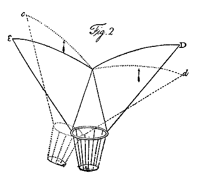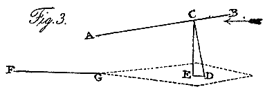 This angular form, with the apex downward, is the chief basis of stability in aerial navigation; but as the sheet which is to suspend the weight attached to it, in its horizontal path through the air, must present a slightly concave surface in a small angle with the current, this principle can only be used in the lateral extension of the sheet; and this most effectually prevents any rolling of the machine from side to side. Hence, the section of the inverted parachute, Fig. 2, may equally well represent the cross section of a sheet for aerial navigation. The principle of stability in the direction of the path of the machine, must be derived from a different source. Let A B, Fig. 3, be a longitudinal section of a sail, and let C be its centre of resistance, which experiment shows to be considerably more forward than the centre of the sail. Let C D be drawn perpendicular to A B, and let the centre of gravity of the machine be at any point in that line, as at D. Then, if it be projected in a horizontal path with velocity enough to support the weight, the machine will retain its relative position, like a bird in the act of skimming; for, drawing C E perpendicular to the horizon, and D E parallel to it, the line C E will, at some particular moment, represent the supporting power, and likewise its opponent the weight; and the line D E will represent the retarding power, and its equivalent, that portion of the projectile force expended in overcoming it: hence, these various powers being exactly balanced, there is no tendency in the machine but to proceed in its path, with its remaining portion of projectile force. |