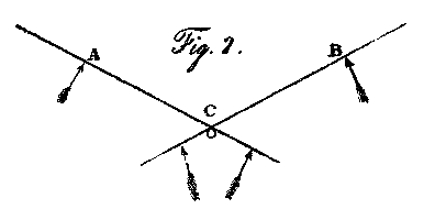 Let A and B, fig. 2, be two wings continued beyond the pole or hinge upon which they turn at C. If the extreme parts at A and B be long and narrow, they may be balanced, when in the act of skimming, by a broad extension of less length on their opposite sides; this broad extension, like the lower part of the wing, will always give nearly the same support, and the propelling part of the surface will be at liberty to act unincumbered by the leverage of its supporting power. This plan may be modified many different ways; but my intention, as in the former case, is still the principle in its simplest form.