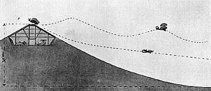 According to the example of birds, man will have to start against the wind; but as an inclined surface is necessary for this he needs a hill having the shape of a flat cone, from the top of which he may take starts against the wind in any direction. Such a place is absolutely necessary, if one wishes to make flying experiments in a convenient way without being dependent on the direction of the wind. For this purpose I have had an artificial hill, 15 metres high, erected near my house in Gross Lichterfelde, near Berlin, and so have been enabled to make numerous experiments. The drawings show this hill, or part of the same, from the outside. Fig. 9 represents a section of it, showing the cavity in the top intended for keeping the apparatus. At the same time the line of flight taken in calm weather is shown by dotted lines.