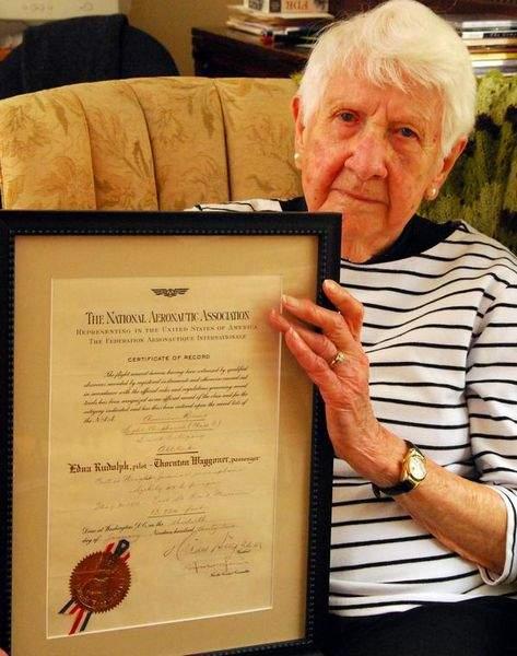 Edna Paul holds a certificate naming her a record-holder pilot from the The National Aeronautic Association |