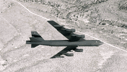 All B-52s are equipped with an electro-optical viewing system that uses platinum silicide forward-looking infrared and high resolution low-light-level television sensors to augment the targeting, battle assessment, flight safety and terrain-avoidance system, thus further improving its combat ability and low-level flight capability. Pilots wear night vision goggles (NVGs) to enhance their night visual, low-level terrain-following operations. Night vision goggles provide greater safety during night operations by increasing the pilot's ability to visually clear terrain and avoid enemy radar. Starting in 1989, an on-going modification incorporates the global positioning system, heavy stores adaptor beams for carrying 2,000 pound munitions and additional smart weapons capability. All aircraft are being modified to carry the AGM-142 Raptor missile and AGM-84 Harpoon anti-ship missile. The use of aerial refueling gives the B-52 a range limited only by crew endurance. It has an unrefueled combat range in excess of 8,800 miles (14,080 kilometers). The aircraft's flexibility was evident during the Vietnam War and, again, in Operation Desert Storm.B-52s struck wide-area troop concentrations, fixed installations and bunkers, and decimated the morale of Iraq's Republican Guard. The Gulf War involved the longest strike mission in the history of aerial warfare when B-52s took off from Barksdale Air Force Base, La., launched conventional air launched cruise missiles and returned to Barksdale -- a 35-hour, non-stop combat mission. Background For more than 35 years B-52 Stratofortresses have been the primary manned strategic bomber force for the United States. The B-52 is capable of dropping or launching a significant array of weapons in the U.S. inventory. This includes gravity bombs, cluster bombs and precision guided missiles. Updated with modern technology, the B-52 will continue into the 21st century as an important element of our nation's defenses. Current engineering analysis show the B-52's life span to extend beyond the year 2045. The B-52A first flew in 1954, and the B model entered service in 1955. A total of 744 B-52s were built with the last, a B-52H, delivered in October 1962. Only the H model is still in the Air Force inventory and all are assigned to Air Combat Command. The first of 102 B-52H's was delivered to Strategic Air Command in May 1961. The H model can carry up to 20 air launched cruise missiles. In addition, it can carry the conventional cruise missile which was launched from B-52G models during Desert Storm. The B-52's electronic countermeasures suite is capable of protecting itself against a full range of air defense threat systems by using a combination of electronic detection, jamming and infrared countermeasures. The B-52 can also detect and counter missiles engaging the aircraft from the rear. These systems are undergoing continuous improvement in order to enable them to continue to counter emerging threat systems. General Characteristics Primary Function: Heavy bomber Contractor: Boeing Military Airplane Co. Power Plant: Eight Pratt & Whitney engines TF33-P-3/103 turbofan Thrust: Each engine up to 17,000 pounds (7,650 kilograms) Length: 159 feet, 4 inches (48.5 meters) Height: 40 feet, 8 inches (12.4 meters) Wingspan: 185 feet (56.4 meters) Speed: 650 miles per hour (Mach 0.86) Ceiling: 50,000 feet (15,151.5 meters) Weight: Approximately 185,000 pounds empty (83,250 kilograms) Maximum Takeoff Weight: 488,000 pounds (219,600 kilograms) Range: Unrefueled 8,800 miles (7,652 nautical miles) Armament: Approximately 70,000 pounds (31,500 kilograms) mixed ordnance -- bombs, mines and missiles. (Modified to carry air-launched cruise missiles, Harpoon anti-ship and Have Nap missiles.) Crew: Five (aircraft commander, pilot, radar navigator, navigator and electronic warfare officer) Accommodations: Six ejection seats Unit Cost: $30 million Date Deployed: February 1955 Inventory: Active force, 85; ANG, 0; Reserve, 9