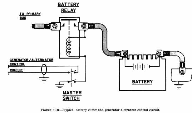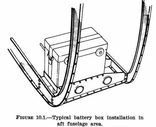 b. Protection from Engine Heat. The installation should protect the battery from extreme engine heat, which would be detrimental to the battery's service life and reliability. Such protection should provide for the temperatures encountered after engine shutdown as well as during engine operation. When locating the battery within the engine compartment, choose a location that will not interfere with the flow of engine cooling air. c. Protection from Mechanical Damage. Vibration and other shock loads are a major cause of short battery life. Whenever possible install the battery in a manner or location that will minimize damage from airframe vibration and prevent accidental damage by passengers or cargo. d. Passenger Protection. Enclose the battery in a box or other suitable structure to protect passengers from any fumes or electrolyte that may be spilled as a result of battery overheating, minor crash, inverted flight, and/or rapid decompression if the battery is located within the aircraft's pressure vessel. e. Airframe Protection. Protect the airframe structure and fluid lines by applying asphaltic or rubber-base paint to the areas adjacent to and below the battery or battery box. Apply paralketone, heavy grease, or other comparable protective coating to control cables in the vicinity of the battery or battery box. Damage to adjacent fabric covering and electrical equipment can be minimized by providing a battery sump jar containing a neutralizing agent, properly locating battery drains and vent discharge lines, and adequately venting the battery compartment. 178. DUPLICATION OF THE MANUFACTURER'S INSTALLATION. The availability of ready made parts and attachment fittings may make it desirable to consider the location and type of installation selected and designed by the airframe manufacturer. Appreciable savings in time and work may be realized if previously approved data and/or parts are used. 179. OTHER INSTALLATIONS. If the battery installation has not been previously approved, or if the battery is to be installed or relocated in a manner or location other than provided in previously approved data, perform static tests on the completed installation as outlined in chapter 1 of this handbook. Because of the concentrated mass of the battery, the support structure should also be rigid enough to prevent undue vibration which would lead to early structural failure. Typical illustrations of battery support structure are shown in figures 10.1 thru 10.4. {See Figure 10.2} {See Figure 10.3} 180. - 185. [RESERVED] Section 2. INSTALLATION 186. SECURING THE BATTERY. Install the battery box or hold-downs in such a manner as to hold the battery securely in place without subjecting it to excessive localized pressure which may distort or crack the battery case. Use rubber or wooden blocks protected with paraffin or asphaltic paint as spacers within the battery box, as necessary, to prevent shifting of the battery and possible shorting of the battery terminals or cables. Also, provide adequate clearance between the battery and any bolts and/or rivets which may protrude into the battery box or compartment. 187. VENTING. Provide suitable venting to the battery compartment to prevent the accumulation of the hydrogen gas evolved during operation. For most aircraft batteries, an airflow of 5 cubic feet per minute is sufficient to purge the battery compartment of explosive concentrations of hydrogen. a. Manifold Type. In this type of venting, one or more batteries are connected, via battery or battery box vent nipples, to a hose or tube manifold system as shown in figure 10.5. Fasten such hoses securely to prevent shifting and maintain adequate bend radii to prevent kinking. (1) The upstream side of the system is connected to a positive pressure point on the aircraft, and the downstream side is usually discharged overboard to a negative pressure area. It is advisable to install a battery sump jar in the downstream side to neutralize any corrosive vapors that may be discharged. (2) When selecting these pressure points, select points that will always provide the proper direction of airflow through the manifold system during all normal operating attitudes. Reversals of flow within the vent system should not be permitted when a battery sump jar is installed, as the neutralizing agent in the jar may contaminate the electrolyte within the battery. b. Free Airflow Type. Battery cases or boxes that contain louvers may be installed without an individual vent system, provided: (1) The compartment in which the battery is installed has sufficient airflow to prevent the accumulation of explosive mixtures of hydrogen; (2) Noxious fumes are directed away from occupants; and (3) Suitable precautions are taken to prevent corrosive battery fluids or vapors from damaging surrounding structure, covering, equipment, control cables, wiring, etc. 188. DRAINS. Position battery compartment drains so that they do not allow spillage to come in contact with the aircraft during either ground or flight attitudes. Route the drains so that they have a positive slope without traps. Drains should be at least 1/2" in diameter to prevent clogging. 189. ELECTRICAL INSTALLATION. a. Cables/Connectors. Use cables and/or connectors that are adequately rated for the current demand and are properly installed (See AC 43.13-1A, "Acceptable Methods, Techniques, and Practices - Aircraft Inspection and Repair," chapter 11). It may be necessary to contact the battery manufacturer to determine current value of the battery at the 5 minute discharge rate. Cable size can also be selected by using the same gauge as used on a previously approved production aircraft with the same battery. (1) The cables should be of sufficient length to prevent undue strain on the battery connector or terminals. (2) Clamp and protect cables, including the bus, in a very secure manner. Since these units are not fused, any fault could cause loss of the entire electrical system in a
