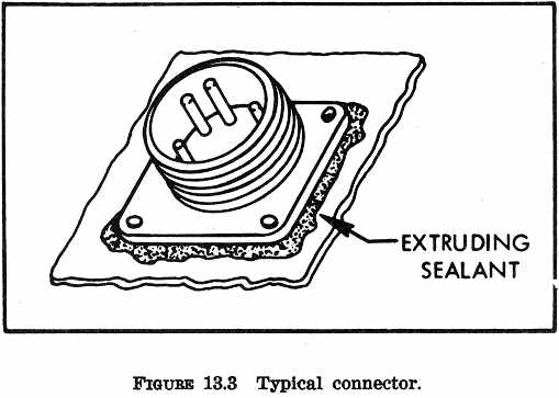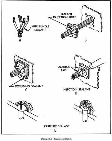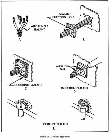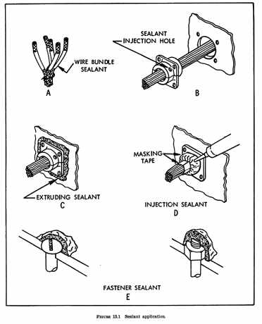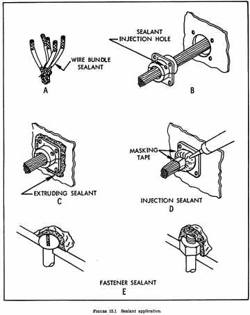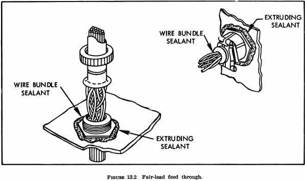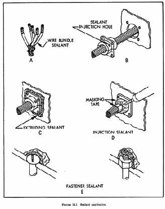 Caution: Sealant and solvents may contain toxic and/or flammable components. Avoid inhalation of vapors and supply adequate ventilation. Wear appropriate respiratory protection while using these materials in confined areas. Avoid contact with the skin and eye. 262. CLEANING. Use a cleaning solvent and clean a larger area than required for the fairlead or connector. Remove solvent by blasting with dry air and wiping with a clean soft cloth. 263. APPLICATION OF SEALANT. Seal electrical wire bundles and connectors where they pass through the opening in the pressurized structure. a. Separate and coat each wire with sealant over the length which is to pass through the fairlead, figure 13.1A. After coating each wire with sealant, pull the wire bundle into position in the fairlead, figure 13.1B. Assure that the fairlead is located on the pressure side of the structure. b. Apply sealant to the surface of the fairlead which comes in contact with the pressurized structure. Use a spatula or brush and spread sealant on the entire surface approximately 1/32 inch in thickness. Attach the fairlead to the pressurized structure, sealant, sealant should extrude around the mounting flange (see figure 13.1C). c. Wrap the fairlead with at least three turns of masking tape as shown in figure 13.1D. Puncture the masking tape over the injection hole in the fairlead assembly and inject sealant with a sealing gun. Apply sealant over each fairlead fastener as shown in figure 13.1E. d. Complete all of the aforementioned steps during the application time of the sealant. Allow sealant to cure, remove masking tape and excess sealant which extruded from the fairlead mounting flange. e. Figures 13.2 and 13.3 illustrate a different type fairlead and wire bundle connector. The procedure for sealant application is the same as previously described. f. Figure 13.4 illustrates various coaxial connectors frequently used for installation through structure. Fairleads are not recommended for installation of coaxial cable. Sealant application is the same as previously described. 264. - 290. [RESERVED] |