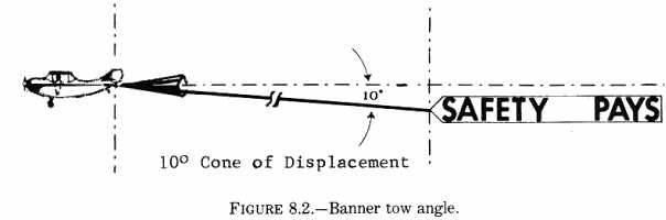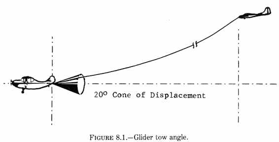 a. Glider tow hitches. Protection for the towplane is provided by requiring use of a towline assembly which will break prior to structural damage occurring to the towplane. The normal tow load of a glider rarely exceeds 80 percent of the weight of the glider. Therefore, the towline assembly design load for a 1,000 pound glider could be estimated at 800 pounds. By multiplying the estimated design load by 1.5 (to provide a safety margin), we arrive at a limit load value of 1,200 pounds. The 1,200 pound limit load value is used in static testing or analysis procedures per paragraph 127 of this handbook to prove the strength of the tow hook installation. When the hook and structure have been proven to withstand the limit load, then the MAXIMUM breaking strength of the towline assembly is established at the design load of 800 pounds. Thus, the towline will break well before structural damage will occur to the towplane. {See Figure 8.1.} Another approach can be applied if the limit load carrying capabilities of a tow hook and fuselage are known. In this case, the known load value can be divided by 1.5 to arrive at the design load capabilities if the tow hook and fuselage limit loads are known to be 1,800 pounds. By dividing by 1.5 (1800 divided by 1.5 = 1,200) we arrive at a design load value of 1,200 pounds. Thus, the maximum breaking strength of the towline assembly is established at 1,200 pounds and provides protection for the towplane. Thus, in considering tow hook installations, one may establish maximum towline breaking strength by: (1) Dividing the known limit load capabilities of the fuselage and two hook installation by 1.5; or (2) Knowing the design load needs of the towline assembly and multiplying by 1.5 to arrive at a limit load. Then by analysis or static testing, determine that the hook and fuselage are capable of withstanding that limit load. b. Banner tow hitches. Install the hitch to support a limit load equal to at least two times the operating weight of the banner. 127. STRUCTURAL TESTING. Adequacy of the aircraft structure to withstand the required loads can be determined by either static test or structural analysis. a. Static testing. When using static tests to verify structural strength, subject the tow hitch to the limit load (per paragraph 126 a or b) in a rearward direction within the appropriate cone of displacement per figure 8.2. Testing to be done in accordance with the procedures of Chapter 1, paragraph 3, of this handbook. b. Structural analysis. If the local fuselage structure is not substantiated by static test for the proposed tow load, using a method that experience has shown to be reliable, subject the fuselage to engineering analysis to determine that the local structure is adequate. Use a fitting factor of 1.15 or greater in the loads for this analysis. 128. ATTACHMENT POINTS. Tow-hitch mechanisms are characteristically attached to, or at, tiedown points or tailwheel brackets on the airframe where the inherent load bearing qualities can be adapted to towing loads. Keep the length of the hitch assembly arm from the airframe attachment point to the tow hook to a minimum as the loads on the attachment bolts are multiplied by increases in the moment arm. 129. ANGLES OF TOW. Tests should be conducted on the system at various tow angles to insure that: a. There is no interference with the tailwheel or adjacent structure.