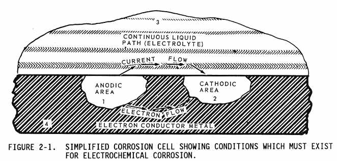 200. INTRODUCTION. This chapter briefly describes corrosion theory, the causes of corrosion, and the factors which influence its development. The various forms of corrosion and common corrosive agents are also described. 201. BACKGROUND. a. Corrosion is a natural phenomenon which attacks metal by chemical or electrochemical action and converts it into a metallic compound, such as an oxide, hydroxide, or sulfate. Corrosion is to be distinguished from erosion, which is primarily destruction by mechanical action. The corrosion occurs because of the tendency for metals to return to their natural state. Noble metals, such as gold and platinum, do not corrode since they are chemically uncombined in their natural state. Four conditions must exist before corrosion can occur (see Figure 2-1): |