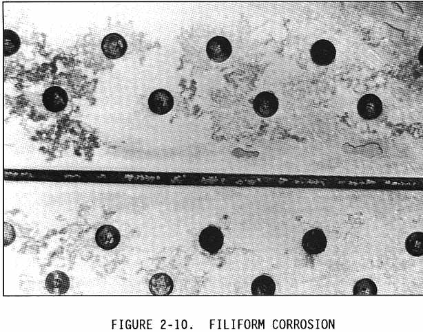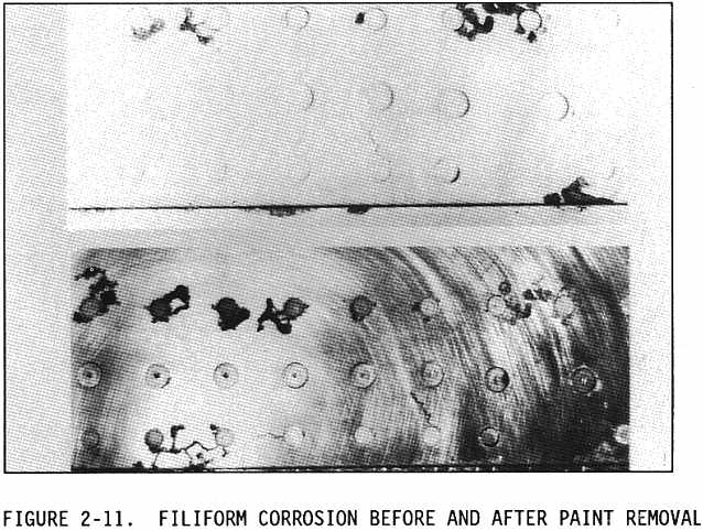 Filiform corrosion is a special form of oxygen concentration cell corrosion or crevice corrosion which occurs on metal surfaces having an organic coating system. It is recognized by its characteristic wormlike trace of corrosion products beneath the paint film (see Figures 2-10 and 2-11). Filiform occurs when the relative humidity of the air is between 78 and 90 percent and the surface is slightly acidic. Corrosion starts at breaks in the coating system and proceeds underneath the coating due to the diffusion of water vapor and oxygen from the air through the coating. Filiform corrosion can attack steel and aluminum surfaces. The traces never cross on steel, but they will cross under one another on aluminum which makes the damage deeper and more severe for aluminum. If filiform corrosion is not removed and the area treated and a protective finish applied, the corrosion can lead to intergranular corrosion, especially around fasteners and at seams. Filiform corrosion can be removed using glass bead blasting material with portable abrasive blasting equipment and/or mechanical means such as buffing or sanding. Filiform corrosion can be prevented by storing aircraft in an environment with a relative humidity below 70 percent, using coating systems having a low rate of diffusion for oxygen and water vapors, and by washing aircraft to remove acidic contaminants from the surface, such as those created by pollutants in the air.