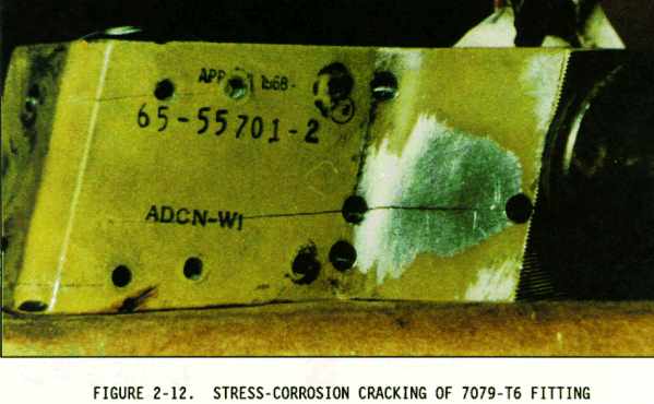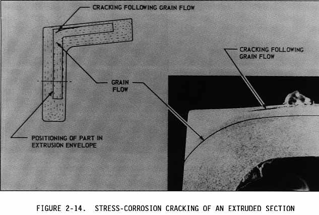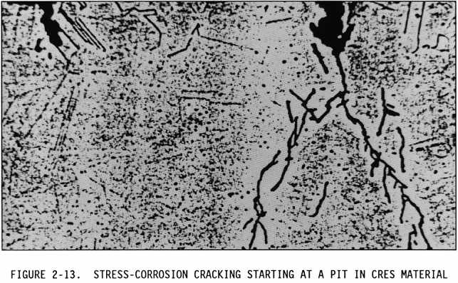 Stress corrosion cracking is an intergranular cracking of the metal which is caused by a combination of stress and corrosion (see Figures 2-12 through 2-14). Stress may be caused by internal or external loading. Internal stresses are produced by nonuniform deformation during cold working, by unequal cooling from high temperatures, and by internal structural rearrangement involving volume changes. Internal stresses are induced when a piece of structure is deformed during an assembly operation, (i.e., during pressing in bushings, shrinking a part for press fit, installing interference bolts, installing rivets, etc.). Concealed stress is more important than design stress, because stress corrosion is difficult to recognize before it has overcome the design safety factor. The level of stress varies from point to point within the metal. Stresses near the yield strength are generally necessary to promote stress corrosion cracking, but failures may occur at lower stresses. Specific environments have been identified which cause stress corrosion cracking of certain alloys. Salt solutions and seawater may cause stress corrosion cracking of high strength heat treated steel and aluminum alloys. Methyl alcohol hydrochloric acid solutions will cause stress corrosion cracking of some titanium alloys. Magnesium alloys may stress corrode in moist air. Stress corrosion may be reduced by applying protective coatings, stress relief heat treatment, using corrosion inhibitors, or controlling the environment. Shot peening a metal surface increases resistance to stress corrosion cracking by creating compressive stresses on the surface which should be overcome by applied tensile stress before the surface sees any tension load. Therefore, the threshold stress level is increased. {Figure 2-13}
