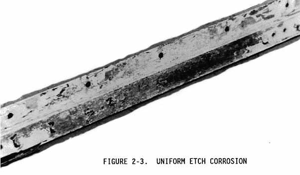 Uniform etch corrosion results from a direct chemical attack on a metal surface and involves only the metal surface (see Figure 2-3). On a polished surface, this type of corrosion is first seen as a general dulling of the surface, and if the attack is allowed to continue, the surface becomes rough and possibly frosted in appearance. The discoloration or general dulling of metal created by exposure to elevated temperatures is not to be considered as uniform etch corrosion.