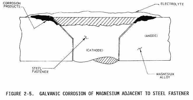 Galvanic corrosion occurs when two dissimilar metals make electrical contact in the presence of an electrolyte (see Figure 2-5). The rate which corrosion occurs depends on the difference in the activities. The greater the difference in activity, the faster corrosion occurs. For example, magnesium would corrode very quickly when coupled with gold in a humid atmosphere, but aluminum would corrode very slowly in contact with cadmium. The rate of galvanic corrosion also depends on the size of the parts in contact. If the surface area of the corroding metal (the anode) is smaller than the surface area of the less active metal (the cathode), corrosion will be rapid and severe. When the corroding metal is larger than the less active metal, corrosion will be slow and superficial. For example, an aluminum fastener in contact with a relatively inert Monel structure may corrode severely, while a Monel bracket secured to a large aluminum member would result in a relatively superficial attack on the aluminum sheet.