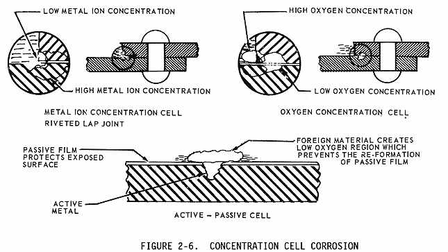Concentration cell corrosion is corrosion of metals in a metal to metal joint, corrosion at the edge of a joint even though joined metals are identical, or corrosion of a spot on the metal surface covered by a foreign material (see Figure 2-6). Another term for this type of corrosion is crevice corrosion. Metal ion concentration cells, oxygen concentration cells, and active passive cells are the three general types of concentration cell corrosion.