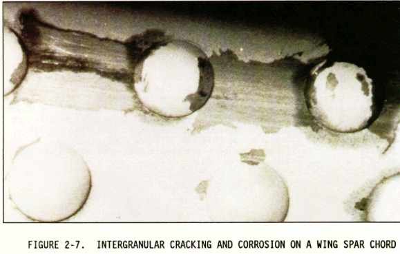 Intergranular corrosion is an attack along the grain boundaries of a material. Each grain has a clearly defined boundary which, from a chemical point of view, differs from the metal within the grain center. The grain boundary and grain center can react with each other as anode and cathode when in contact with an electrolyte. Rapid selective corrosion at the grain boundary can occur with subsequent delamination (see Figure 2-7). High strength aluminum alloys such as 2014 and 7075 are more susceptible to intergranular corrosion if they have been improperly heat treated and are then exposed to a corrosive environment.