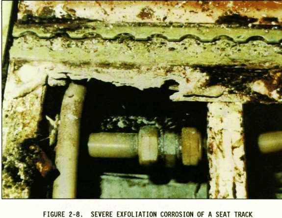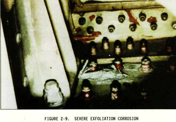 Exfoliation corrosion is an advanced form of intergranular corrosion where the surface grains of a metal are lifted up by the force of expanding corrosion products occurring at the grain boundaries just below the surface. The lifting up or swelling is visible evidence of exfoliation corrosion (see Figures 2-8 and 2-9). Exfoliation is most prone to occur in wrought products such as extrusions, thick sheet, thin plate and certain die forged shapes which have a thin, highly elongated platelet type grain structure. This is in contrast with other wrought products and cast products that tend to have an equiaxed grain structure.