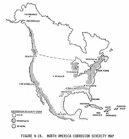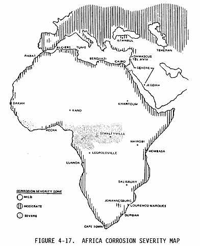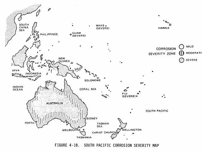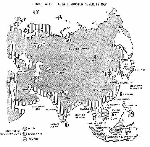 c. The flight routes and bases of operation will expose some airplanes to more corrosive conditions than others. The operational environment of an aircraft may be categorized as mild, moderate, or severe, with respect to the corrosion severity of the operational environment. The corrosion severity of the operational environments around the world are identified in Figure 4-15 through Figure 4-20. The corrosion severity of any particular area may be increased by many factors including: airborne industrial pollutants, chemicals used on runways and taxiways to prevent ice formation, humidity, temperatures, prevailing winds from corrosive environment, etc. {Fig. 4-16, Fig 4-17, Fig 4-18, Fig 4-19}