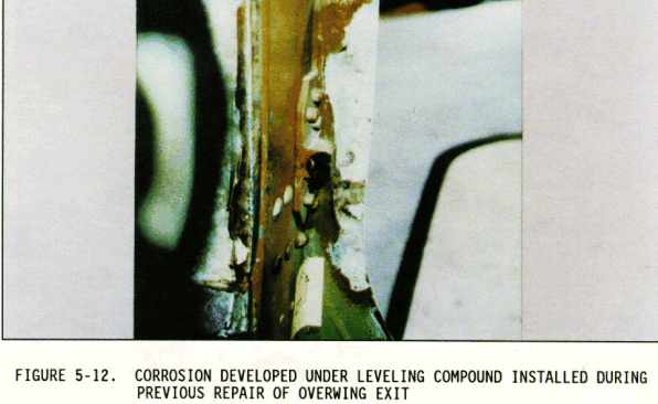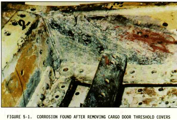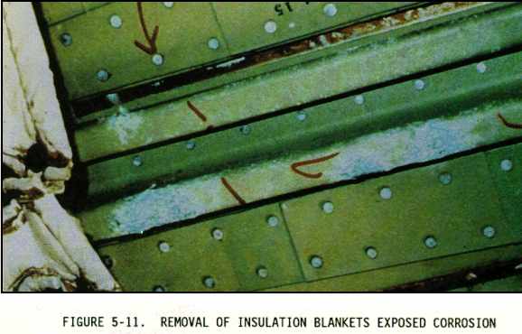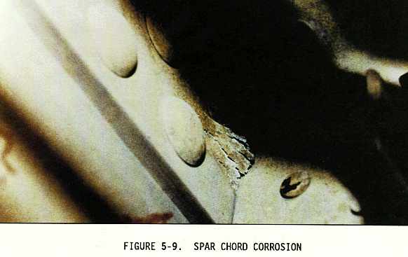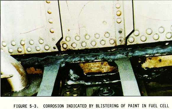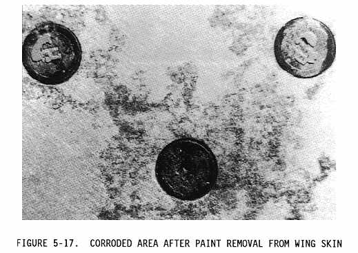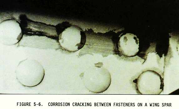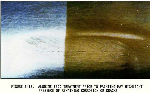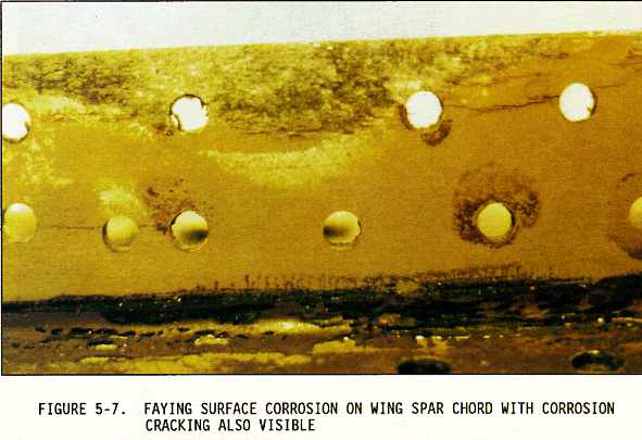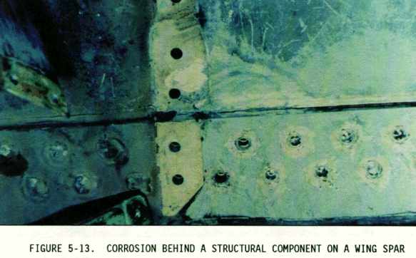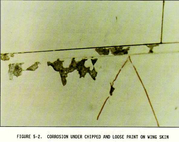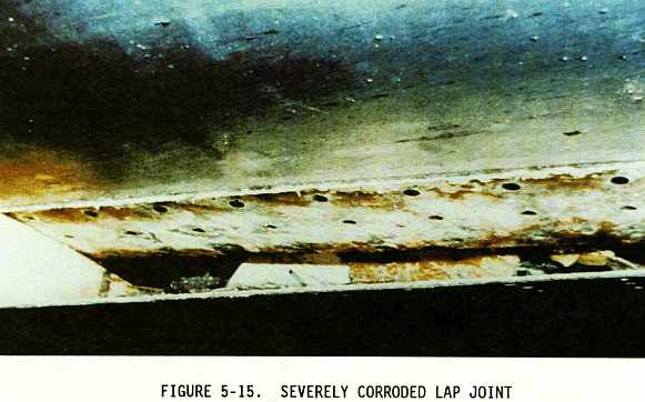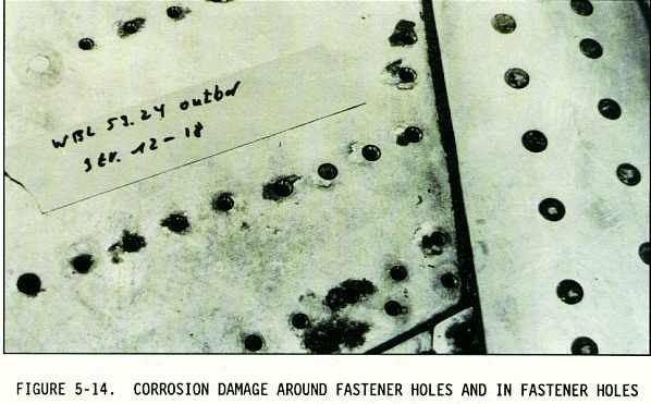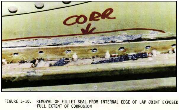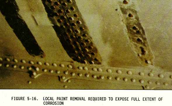 (2) Sometimes the inspection areas are obscured by structural members, equipment installations, or for some other reason are awkward to check visually. Adequate access for inspection must be obtained by removing access panels and adjacent equipment, cleaning the area as necessary, and removing loose or cracked sealants and paints. Mirrors, borescopes, and fiber optics are useful in providing the means of observing obscure areas. Figures 5-10 through 5-18 depict some of these conditions.