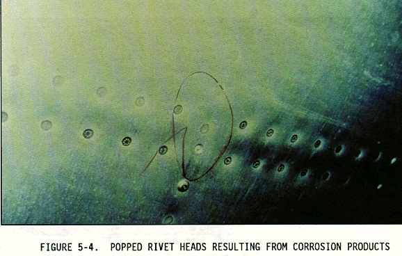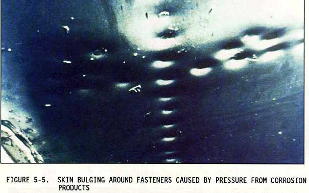 Visual inspection is the most widely used technique and is an effective method for the detection and evaluation of corrosion. Visual inspection employs the eyes to look directly at an aircraft surface, or at a low angle of incidence to detect corrosion. Using the sense of touch of the hand is also an effective inspection method for the detection of hidden well developed corrosion. Other tools used during the visual inspection are mirrors, borescopes, optical micrometers, and depth gauges. The following shows the type of corrosion damage detectable using the visual inspection method: Figures 5-2 and 5-3 show chipped, missing, and lifted paint; Figure 5-4 shows dished and popped rivets; Figure 5-5 shows skin bulges or lifted surfaces; Figures 5-6 and 5-7 show cracks; and Figures 5-8 and 5-9 show corrosion products.