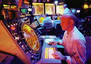 Air traffic controllers in the Carrier Air Traffic Control Center on board the USS Enterprise (CVN 65) assist in guiding the strike aircraft in and out of Iraq on Dec. 17, 1998, during Operation Desert Fox. Enterprise and its embarked Carrier Air Wing 3 are operating in the Persian Gulf in support of Desert Fox. DoD photo by Petty Officer 2nd Class Michael W. Pendergrass, U.S. Navy. |