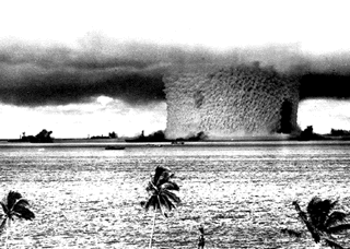 JULY 1--Operation Cross Roads--Tests to determine effects of atomic bombs on naval targets were conducted at Bikini Atoll in the Pacific. In the first test, a Nagasaki-type bomb, dropped from a B-29 at 30,000 feet on ships anchored in the lagoon, sank five of them outright and did heavy damage to nine others.