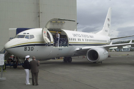 Seattle, Sept. 9, 2000, the Boeing Company today rolled out the first Boeing 737-700C airplane, designated as the C-40A Clipper by the U.S. Naval Reserve, at a festive celebration held at Boeing Field in Seattle. Hundreds of Boeing employees along with U.S. Navy personnel who worked on the program attended the ceremony for their first look at the C-40A Clipper painted in U.S. Navy colors. "We are very pleased to celebrate the premiere of the C-40 Clipper today," said Mark Rogers, director of Boeing Derivative Airplane Programs. "This airplane will serve the U.S. Naval Reserve well, and we look forward to providing the government with many more 737 Next Generation airplanes in the future." The U.S. Naval Reserve, which will operate and maintain the aircraft, is the first customer for the newest member of the Boeing Next-Generation 737 family and is purchasing the aircraft to replace its fleet of aging C-9 Skytrains. Currently, the Naval Reserve provides 100 percent of the Navy's worldwide in-theater medium and heavy airlift. "Nearly 25 percent of our C-9s are more than 30 years old," said Rear Adm. |