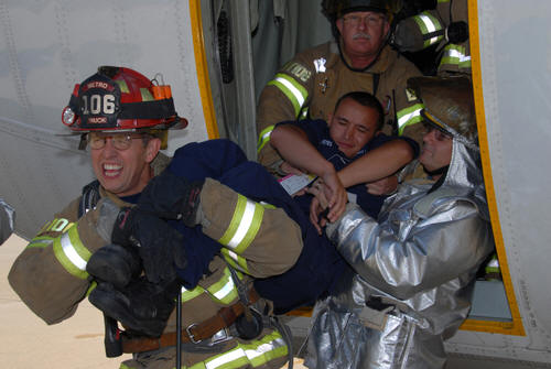 June 19, 2009, Coast Guard Air Station Sacramento -- The U.S. Coast Guard, in coordination with partner federal and local agencies, participated in a mass casualty exercise that simulated a midair collision of a C-130 Hercules aircraft, from Coast Guard Air Station Sacramento, and a Sacramento Sheriff's Department helicopter, at McClellan Airfield, yesterday morning. Representatives from the Sacramento Metro Fire Department, Sacramento Police Department, FBI, Federal Emergency Management Association, and a Redwood Emergency Air Care helicopter also participated in the simulated mishap. Before the drill took place this morning, the various agencies met to discuss response efforts and potential limitations. The discussion focused on the importance of safety and communications. The drill was designed to better prepare responders for an aviation mishap.