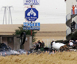 Air France Concord Goes Down July 25, 2000, Air France Concorde flight AF4590, crashed on take-off from Paris-Charles de Gaulle airport at 4:44 p.m. today. The Concord was caring 100 passengers, 9 cabin and cockpit crew. The aircraft departed with a destination to John F. Kennedy International Airport in New York. All onboard as well as 4 persons on the ground were killed. The aircraft cashed into a nearby hotel. The cockpit-voice recorder indicated the tower had informed the captain he had flames shooting out of the port side of the jet. The captained radioed back he had engine failure to number 2 engine on the left side of the jet closest to the fuselage, was unable to raise the landing gear. The controllers advised the captain he had cleared all traffic and he was cleared to maneuver the jet. The Concord was unable to gain altitude, it banked to the left then crashed.As the plane rotated off the runway, number 2 engine left side became sluggish however within monents it returned to normal function, then number 2 enine lost power a second time about a minute into the flight. It was at that point, investigators said, that the plane stalled then banked to the left and then crashed. Flight AF 4590 was scheduled for departure from Paris at 3 :25 PM local time. The aircraft left the parking space at 4.31 PM, an hour and 6 minutes late. There were two reasons for this delay. During the earlier return flight from New york (JFK) on 24 July for this aircraft, the captain reported the number 2 engine reverse thrusters were not operational. The spare part for the reverse thruster was not available in the parts warehouse. However, given the technical tolerance authorized by the manufacturer, the aircraft could take off again without being repaired. This information was presented to the captain of Flight AF 4590 The captain made the decision to have the spare part changed. The spare part was immediately obtained from another spare Concorde (it took 30 minutes to make the necessary repairs). The 100 passengers on this special flight had very short connections at Paris-Charles de Gaulle Airport, and were all carrying luggage. Due to the late arrival of some of the luggage from the connecting flights, the Concorde was delayed even further. Only after the spare part was replaced and the luggage loaded did the captain make the decision to depart. It has been reported that on takeoff the jet blew a tire. This is not the first time that the Concord had experienced a blown tire on takeoff. Several months back, the Concord blew a tire and pieces of tire broke up and ripped into the fuel tank. The Concordes has a history of blowing tires on takeoff and landing and debris from which damage has been caused to engines, fuel tanks, hydraulic systems and wiring. Investigators will be looking at the possibility that a blown tire may have occurred and the possibility that the cause of the Concord going down was directly related to this. The Concord has a length of 203 feet with a wingspan of 82 feet. The concord can carry up to 100 passengers and its cruising altitude is 53,136 ft. The passengers consisted of 96 German, 2 Danish, 1 American and Austrian. The aircraft registration number F-BTSC, the owner: Air France, date of entry into service: 23 October 1980, type of engine: Rolls Royce Olympus 593, number of hours flown: 11,989, number of landings: 3,978, last A check: 21/7/2000, last major overhaul: 4/28/2000, and this aircraft had no microscopic cracks. |