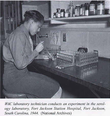 WAACs within the Army Medical Department (ASF) were used as laboratory, surgical, X-ray, and dental technicians as well as medical secretaries and ward clerks, freeing Army nurses for other duties.