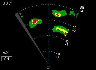 BeamView: Displays a sweeping “flashlight beam” which corresponds to the beam width of the radars’ antenna diameter .By displaying the radar’s beam width as a function of range, pilots can more easily discern targets that are separated by a distance of less than a beam width and which appear on the screen as a single target. BeamView improves the pilot’s ability to identify cells which are distorted by the natural physics of radar, especially at longer ranges where beam width is greatest.