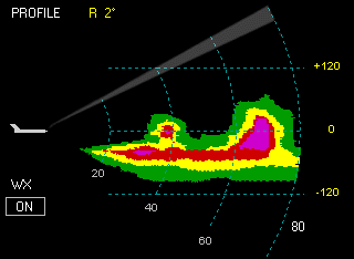 TiltView: A function of the radar’s tilt setting, TiltView computes the relative altitude of the radar beam at each range, and displays this information in yellow adjacent to each range arc on the display scale in thousands of feet.