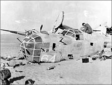 At 2:50 p.m. on Apr. 4, 1943, 25 B-24Ds of the 376th Bomb Group took off from their AAF base at Soluch, Libya, for a high-altitude bombing attack against harbor facilities at Naples, Italy. All planes but one returned safely to Allied territory that night--the one which was missing was the Lady Be Good. Almost 16 years later on Nov. 9th, 1958, several British geologists were flying over the desolate, sun-baked Libyan Desert. At approximately 400 miles south of Soluch, they spotted an aircraft on the sand. A ground party which reached the site in March 1959 discovered plane to be a B-24D. The "Lady Be Good" had been found. Evidence at the site indicated that the crew had become lost in the dark on return from Naples and had flown over their base and southward into the desert. As their fuel supply became depleted, the nine men aboard had bailed out but had disappeared while attempting to walk northward to civilization. Intensive searches were made for clues as to the fate of the crew and in 1960 the remains of eight were found, one near the plane and the other seven far to the north. Five had trekked 78 miles across the tortuous sand before perishing and one had gone an amazing 109 miles. In addition, they had lived eight days rather than only two expected of men in this area with little or no water. |