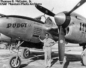 January 7, 1945 Major McGuire scored 38 aerial victories in a P-38, making him our nation's second highest scoring ace. Among his many decorations was the Medal of Honor awarded for his actions on December 25-26, 1944 when he shot down seven enemy aircraft. Major McGuire crashed to his death on Los Negros Island in the Philippines while risking an extremely hazardous maneuver at low altitude in an attempt to save the life of a comrade. McGuire Air Force Base in New Jersey is named in his honor. On January 7, 1945, McGuire was leading a group of four P-38s - himself, Major Jack Rittmayer (four victories), Captain Edwin Weaver (two victories) and Lieutenant Douglas Thropp (one victory) - on a fighter sweep over northern Negros Island in the central Philippines. Their aim was to gain victories. McGuire desperately wanted to pass Major Richard Bong's score of 40 kills. Descending through cloud cover, McGuire’s flight circled a Japanese airfield at Fabrica and then proceeded to a second airstrip at Manapla (also referred to as Carolina). As they approached Manapla, they were confronted by a lone Ki-43 Hayabusa (“Oscar”), which immediately engaged McGuire's flight. Flying in the number-three position, Lt. Thropp saw the Oscar trying to attack him in a head-on pass. Thropp instinctively broke hard left. The Japanese pilot turned with him and fell into position behind him while firing. Major Rittmayer, flying as Thropp's wingman, turned sharply towards and began firing on the attacker. McGuire saw that the Oscar was being engaged by Rittmayer and turned to face an imminent threat to the flight from the opposite direction. Unfortunately for McGuire and his flight, the Japanese pilot, Warrant Officer Akira Sugimoto, was an instructor pilot with some 3,000+ hours in that type of aircraft. |