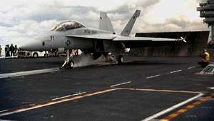 The Navy¹s newest strike-fighter aircraft, the F/A-18F Super Hornet, prepares for its first carrier-based catapult launch from the flight deck of the USS John C. Stennis (CVN 74) as the aircraft carrier conducts flight operations off the coast of North Carolina on Jan. 18, 1997. The Super Hornet will replace the A-6 Intruder and is the programmed replacement for the F-14 Tomcat air superiority fighter. Super Hornet is fully capable of conducting both air to air and air to ground combat missions. Improvements over the F/A-18 C & D models include increases in fuel capacity, engine power, mission radius, weapons stations, aircraft surface area, and increased station time during typical combat air patrol. |