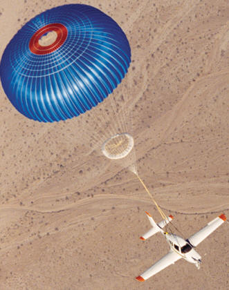 Generally speaking, the parachute deployment system can be operated at the aircraft’s service ceiling to a minimum of 300 feet above ground. In the event of an in flight emergency, the pilot would activate the parachute deployment system by pulling on a red handle situated inside the cockpit. When the system is manually activated, a solid fuel rocket is shot out of a box mounted on or in the aircraft that ballistically jettisons the entire parachute package well clear of the fuselage, wings, and tail. Within seconds, the parachute canopy is fully opened, controlling the aircraft rate of descent. BRS began installing parachute deployment system on the Cessna 150 and 152 aircraft. This was a giant step forward in aviation safety. |