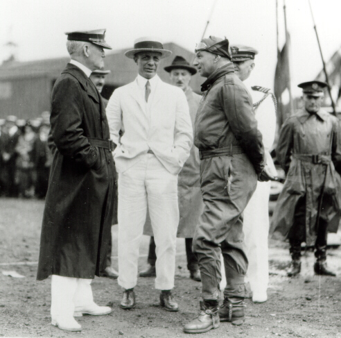 The adventurous airman were: Lieutenants Leigh Wade and H.H. Ogden, Boston; Capt. Lowell H. Smith and Lt. Leslie P. Amold, Chicago; Lieutenants Eric Nelson and Jack Harding, New Orleans; and Maj. Frederick L. Martin and Sgt. Alva Harvey, Seattle. The flyers were bound for such exotic destinations as Alaska, Japan, China, India, Persia, Turkey and Iceland. Unfortunately, two of the original four planes would never realize their goal of circumnavigating the globe. The Seattle hit a mountain peak in Alaska, leaving its crew stranded in the wilderness for 10 days, but luckily very much alive. Then, the Boston crew was forced to crash land in the North Atlantic, with the plane eventually being replaced by the Boston II and the crew resuming its venture in a matter of days. Although the rain-soaked and weary crowd, including President Calvin C. Coolidge and his staff, that gathered at Bolling Field on September 9,1924, would actually witness the return of only two of the aircraft, the enamored crowd would hail each of the original crew of world flyers with equal vigor and pride. The tireless crowd gazed skyward breathlessly and patiently for hours for the delayed arrival of their new heroes of the sky. Finally, at a few minutes before 3 o'clock in the afternoon, the airships Chicago and Boston II soared into view over the Washington skyline and landed at a jubilant Bolling Field. Up to a few hours before, these two planes had been accompanied by the New Orleans, and all three crews had anticipated making the entrance into Washington together. But a few miles short of Baltimore, in Halethorpe, Maryland, the New Orleans had been forced down in a grassy field because of mechanical problems. Fortunately, the repairs were minor and the craft was able to join its sister ships the very next day at Bolling. All three planes remained at Bolling Field for the duration of Defense Day celebrations and were featured performers during the festivities. The morning of September 13, 1924, the gallant airmen embarked to finish the incredible worldwide journey they had begun almost six months before. |