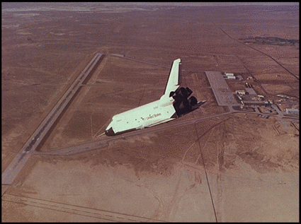 The cameramen started clicking furiously, and exclamations sounded on all sides. The Shuttle descended over Leuhmn Ridge, passed across Highway 58 at Boron, turned west toward Peerless Valley, swung around over North Edwards, and lined up on runway 17. Houston's Mission Control radioed Haise that the Enterprise had a lower lift-to-drag ratio than predicted by tunnel tests. In fact, however, the ratio was just as predicted; Houston had miscalculated. The error caused Haise to fly the final approach at a higher speed, conserving energy to prolong the glide. As a result, the Shuttle was "high and hot" on its final approach. Realizing that the Enterprise would land long, Haise deployed the craft's speed brakes from 30 up to 50 percent. At 275 meters altitude, Haise began the landing flare. As the Enterprise leveled out, he deployed the landing gear. The Shuttle landed long by about 900 meters at 340 kilometers per hour, nearly 5 1/2 minutes after launch. The Shuttle coasted for over 3 kilometers before stopping on the south lakebed; as it slowed, its T-38 chase planes streaked by. Soon the 747 and its lone chase plane swept majestically over the landing site. The first Shuttle free flight had been a success.