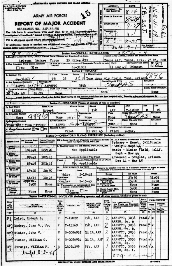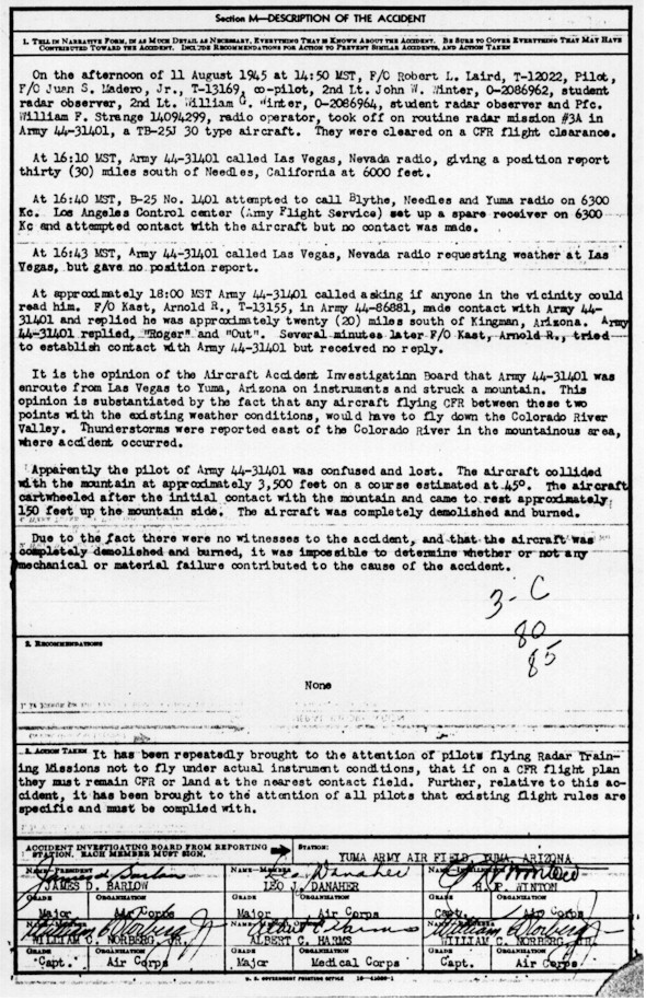 August 11, 1945, a TB-255 aircraft out of Las Vegas, Nevada to Yuma, Arizona crashed into the mountains flying instruments. It was reported that the aircraft was in the vicinity of thunderstorms and the pilot may have been lost and confused. The complete story is listed below from the War Department. It may take a few minutes to download however its worth the wait.