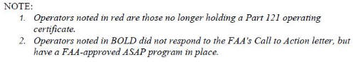 As safety is DOT and FAA's highest priority, “we appreciate the 94% response and will take those commitments very seriously”. The FAA will take non-responses into careful consideration when performing surveillance activities. And those carriers and labor organizations that have not responded must know for a certainty that the American flying public will also judge their reluctance to adopt proven safety practices. It is important to note that several of the carriers have already been using the key safety programs we asked for--Flight Operations Quality Assurance (FOQA) and Aviation Safety Action Program (ASAP). And some carriers are simply too small or have too limited operations to implement FOQA. |