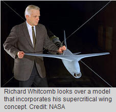 Those who worked with Whitcomb remember him as brilliant, driven and single-minded with aerodynamics dominating his thoughts at work and at home. "I was extremely fortunate to work with Dick Whitcomb from 1974 to 1980, when I was an engineer fresh out of college," said Pete Jacobs, chief engineer for the Ground Facilities and Testing Directorate at NASA Langley. "It was truly an amazing experience to learn from the man who had been referenced in my textbooks. He had an uncanny sense of aerodynamics, unbelievable concentration, and the most phenomenal memory of anyone I've ever met." The famed aerodynamicist retired from NASA Langley in 1980, but his contributions remain some of the research center's greatest accomplishments. "Dick Whitcomb's three biggest innovations have been judged to be some 30 percent of the most significant innovations produced by NASA Langley through its entire history," said Langley chief scientist Dennis Bushnell, who worked with Whitcomb. "That's from its founding in 1917 to the present. He is without the doubt the most distinguished alumnus of the Langley Research Center." Whitcomb earned many honors in his life. Besides the Collier Trophy, he received the National Medal of Science (personally conferred by President Richard Nixon) in 1973, the U.S. Air Force Exceptional Service medal in 1955, the first NACA Distinguished Service Medal in 1956, the NASA Exceptional Scientific Achievement Medal in 1959 and the National Aeronautics Association's Wright Brothers Memorial Trophy in 1974. The engineer was also was inducted into the National Inventors' Hall of Fame in 2003, the National Academy of Engineering in 1976 for his pioneering research in the aerodynamic design of high performance aircraft and the Paul E. Garber First Flight Shrine at the Wright Brothers National Memorial. Whitcomb's alma mater, Worcester Polytechnic Institute, also awarded him an honorary doctorate and its presidential medal. |