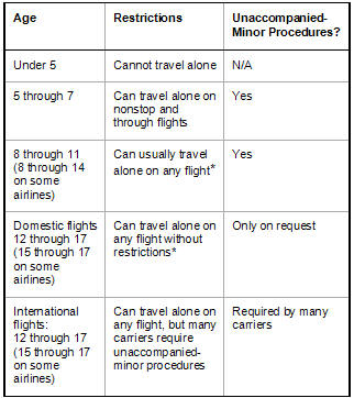 Most On domestic flights some airlines do not require unaccompanied-minor procedures for children 12 and over (15 and over on some airlines), but will apply those procedures—and charge the appropriate fee if applicable (see “Fees” below)—at the request of the parent or guardian. Children under the age of 5 must always be accompanied by someone at least 12 years of age flying in the same cabin (18 years of age on some airlines); airlines do not allow kids under 5 to fly alone. |