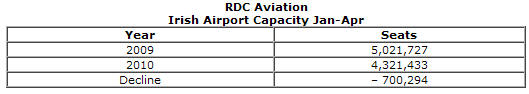 Ryanair has said the statistics disprove Minister Dempsey’s claims that the fall in traffic and tourism is ‘an international phenomenon’ and proves that Irish tourism is being devastated by the government’s €10 tourist tax. The RDC Aviation report highlights that Irish seat capacity (which drives passenger numbers) collapsed by over 140,000 in April and by over 700,000 so far in 2010. |