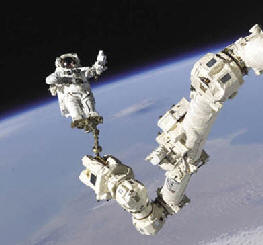| Astronaut Stephen Robinson rides Canadarm 2 during the STS-114 mission of the Space Shuttle Discovery to the ISS in August 2005. | ||||