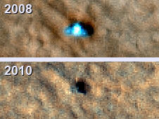 | Two images of the Phoenix Mars lander taken from Martian orbit in 2008 and 2010. The 2008 lander image shows two relatively blue spots on either side corresponding to the spacecraft's clean circular solar panels. In the 2010 image scientists see a dark shadow that could be the lander body and eastern solar panel, but no shadow from the western solar panel. | ||||