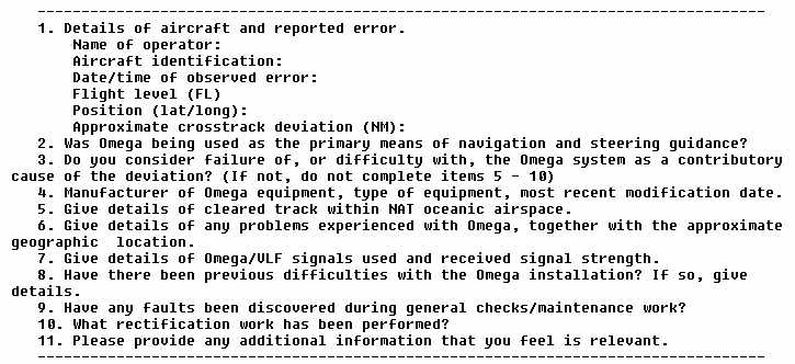 y. Navigation Errors by Omega Equipped Aircraft. If a navigation error is discovered by a crew of an Omega equipped aircraft, or if a crew of an Omega equipped aircraft is notified of a navigation error by ATC, a report containing the information listed in Figure 8-6 should be submitted to the FAA. This information should be sent by mail or facsimile (fax) to the FSDO nearest the aircraft's base of operation or, if applicable, to the FSDO that holds the operator's operating certificate.